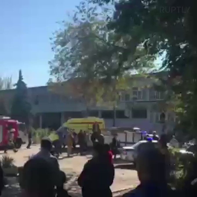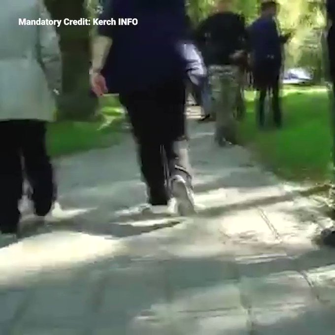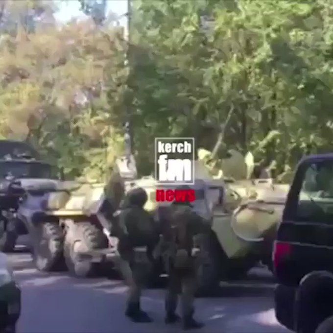 Πλάνα που αναρτήθηκαν στον ιστότοπο του τοπικού ραδιοφωνικού σταθμού Kerch FM έδειξαν θωρακισμένα οχήματα μεταφοράς προσωπικού κοντά στο κολέγιο στο Κερτς.